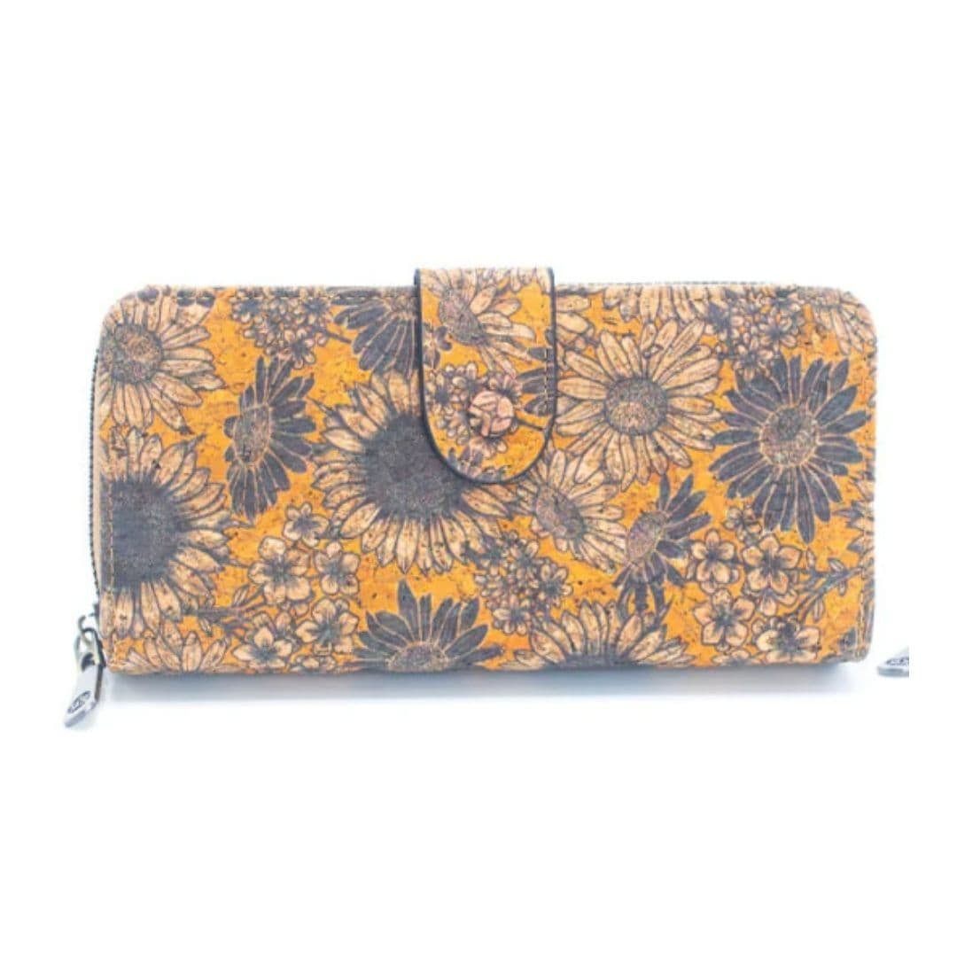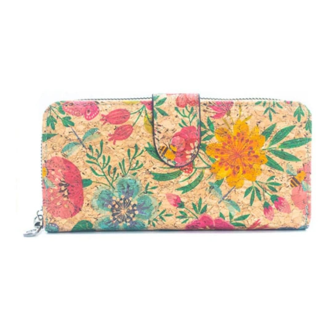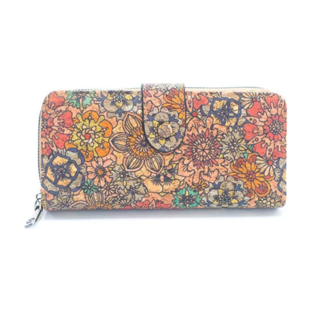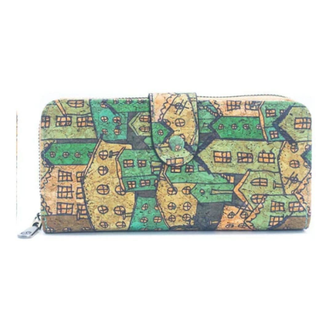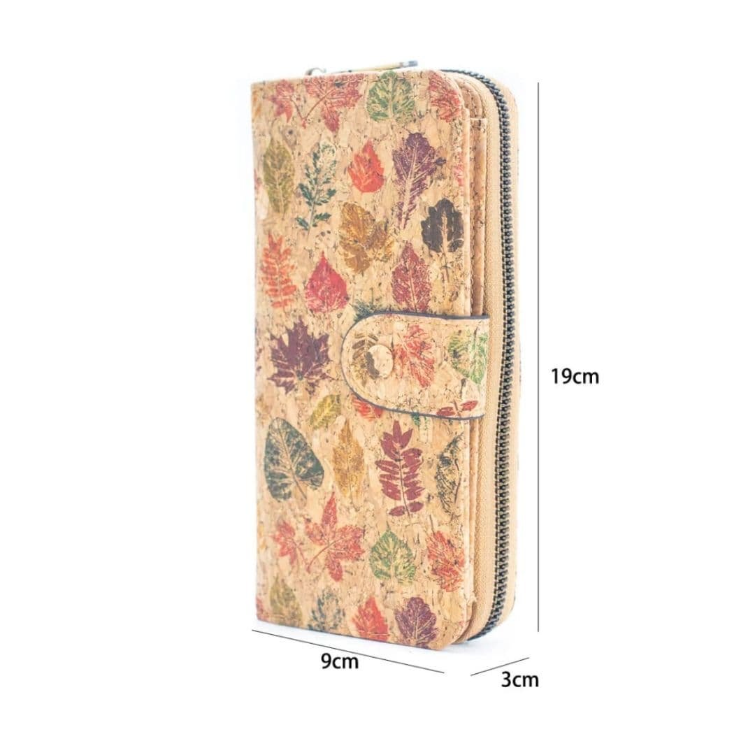 Billetera elaborada artesanalmente en corcho natural con diseños variados sobre el material, que combina estilo y funcionalidad.