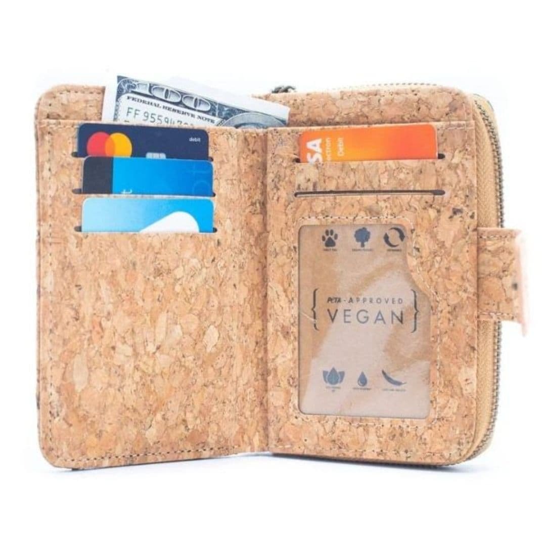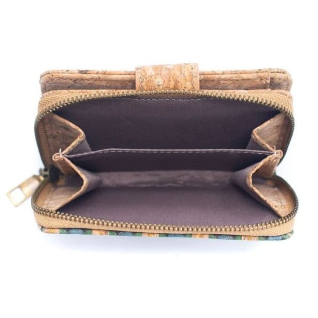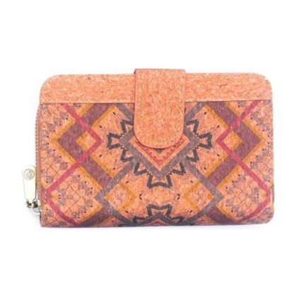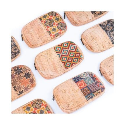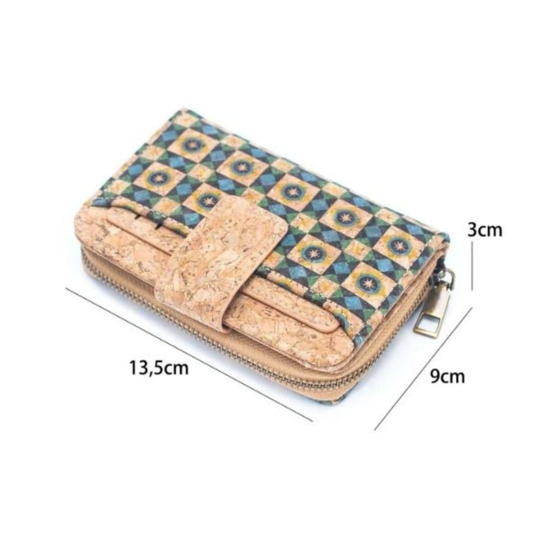 Billetera elaborada artesanalmente en corcho natural con diseños variados, que combina funcionalidad y estilo.