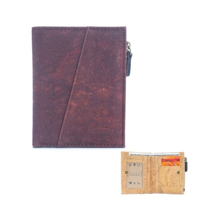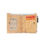 Billetera elaborada artesanalmente en corcho. En su interior cuenta con un compartimento con plástico transparente para una mejor visualización de una identificación importante. Detrás de este incluye dos espacios adicionales para tarjetas. En el lado derecho dispone de tres compartimentos verticales para tarjetas, y en su parte posterior incorpora dos espacios adicionales para el mismo fin.