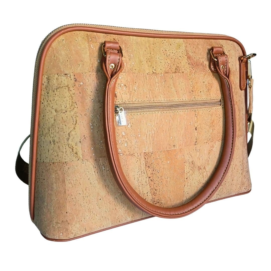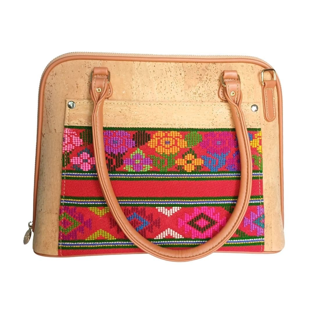 Bolso grande elaborado artesanalmente en corcho natural y telas mayas, que combina tradición, amplitud y funcionalidad.