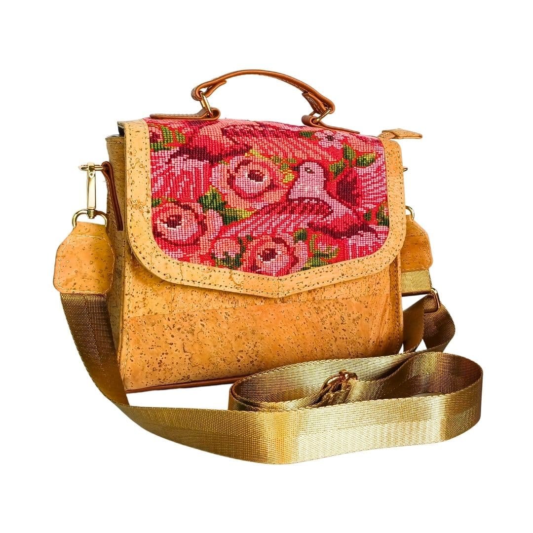 Bolso pequeño de mano, tipo bandolera cuadrado, elaborado artesanalmente con tejidos mayas y corcho natural, que combina tradición y diseño contemporáneo.