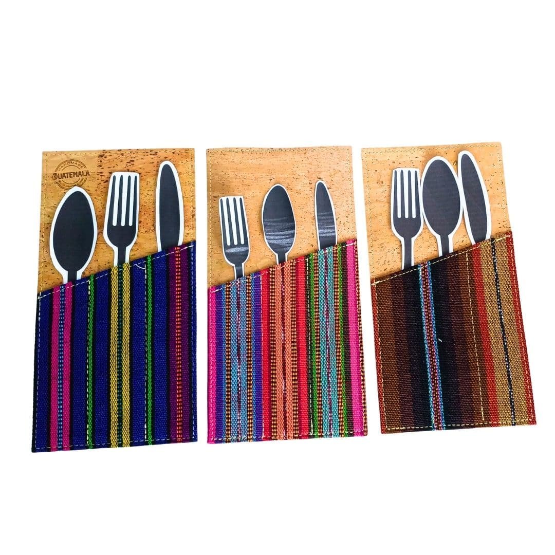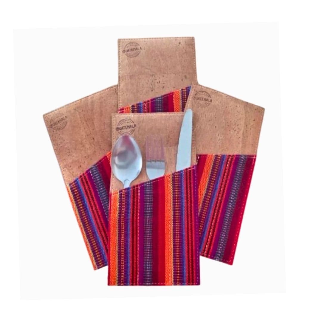 Juego de 4 porta cubiertos elaborado artesanalmente en corcho natural y tela típica, ideal para llevar cubiertos de forma práctica y con un diseño cultural distintivo.